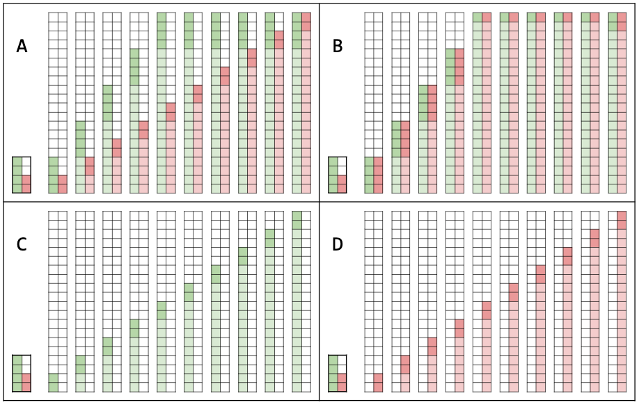 En la gráfica mostrada hay cuatro posibles respuestas a situación, en el diagrama A se muestra que cada vez se suman cuatro puntos buenos y dos puntos malos, algunos pensarían que es lo justo, pero tiene un par de problemas. Llega un punto donde dejamos de contar los puntos buenos y solo aumenta la cuenta de puntos malos, y nos enojamos por que signen dejando el envase vacío en el refrigerador, a pesar de que siguen cocinando todos los días, y llega el momento de una explosión de rencor.